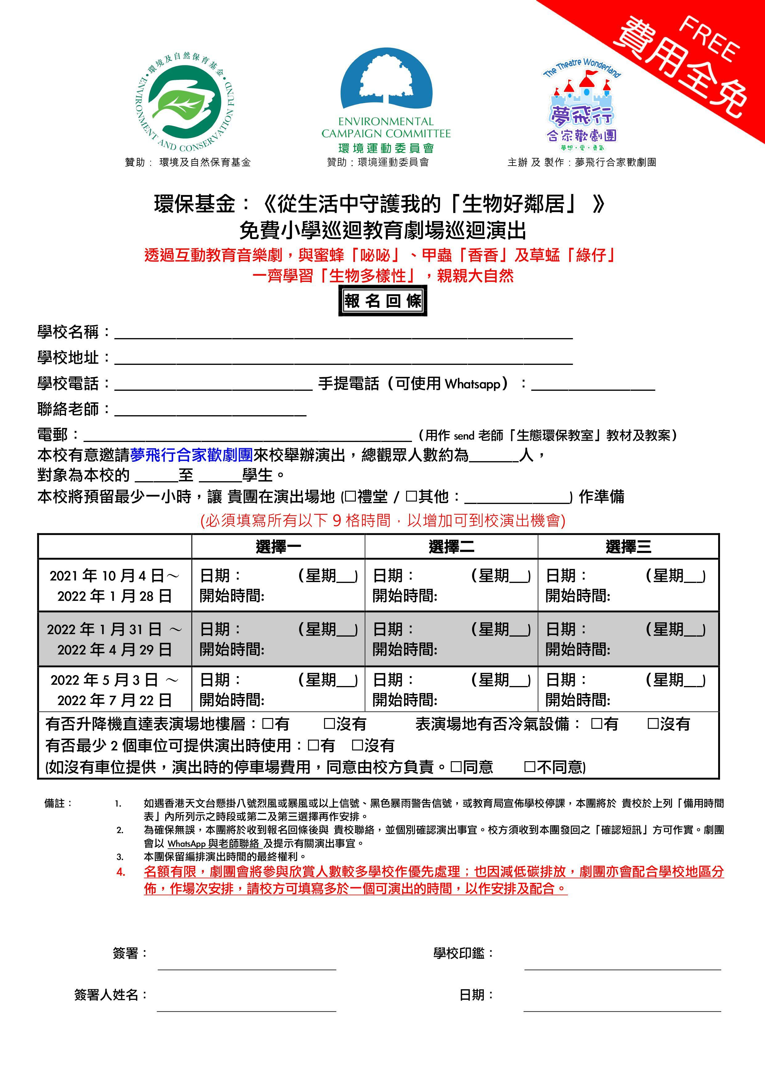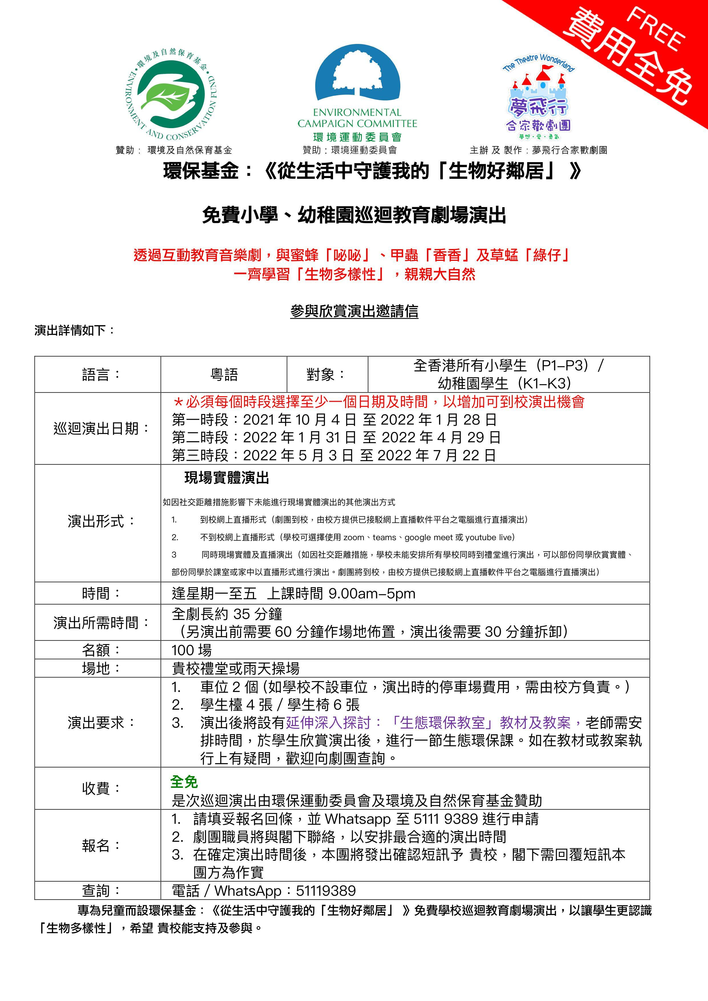 免費幼稚園 (K1-K3) 及小學 (P1-P3) 學校巡迴演出及親子環保活動